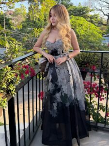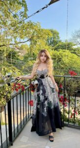 In a wider frame, Cho Zin Win Pyae appears effortlessly composed, interacting naturally with the balcony space. Floral accents, greenery, and architecture work together to enhance visual depth. The photograph communicates calm confidence, making it ideal for editorial use, branding inspiration, or fashion-focused digital content across modern media channels globally.