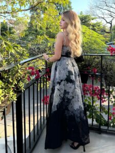 Cho Zin Win Pyae stands on a sunlit balcony, framed by greenery and calm afternoon light. Her flowing dress blends soft florals with elegant structure, creating a refined silhouette. The relaxed posture and thoughtful gaze suggest confidence, grace, and a quiet appreciation for natural surroundings and timeless style today now.
