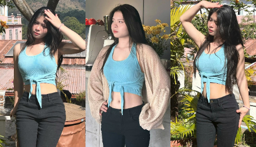 Outside again, Yui Xian shields her eyes slightly from the sun while standing among tropical plants and rustic rooftops. Her relaxed pose and confident expression reflect a lifestyle mood. The bright colors of nature frame Yui Xian perfectly, making the image suitable for fashion or travel content.