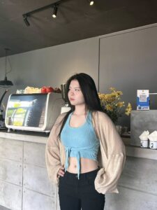 Yui Xian stands confidently inside a stylish café, framed by soft lighting, coffee machines, and fresh flowers. Her turquoise top and black jeans create a modern, casual look. With her hand on her waist and eyes focused ahead, Yui Xian gives the scene a calm, fashionable atmosphere.