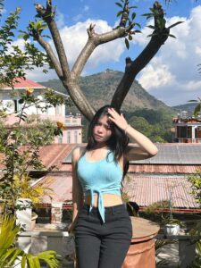 In bright sunlight, Yui Xian poses among lush plants and rooftops, creating a fresh outdoor mood. Her long hair falls naturally as she lightly holds a strand, adding elegance. The blue sky and green leaves highlight Yui Xian’s relaxed confidence and natural beauty in the peaceful setting.