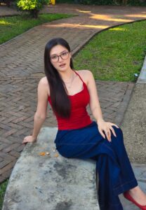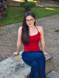 Yamin May Oo sits gracefully in the garden, surrounded by lush greenery and warm afternoon light. Wearing a red sleeveless top and deep blue skirt, she looks calm yet confident as she gently rests her hand on the stone bench. The peaceful setting highlights Yamin May Oo’s soft expression and effortless elegance.