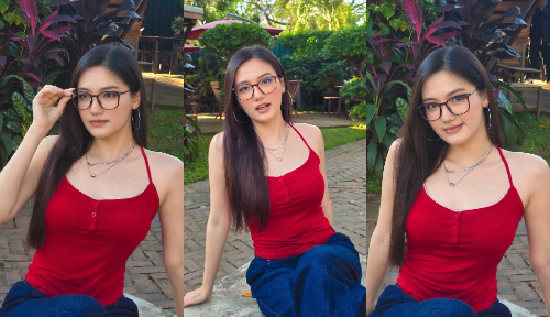 In another moment, Yamin May Oo adjusts her glasses slightly, her long hair falling smoothly over one shoulder. The colorful plants behind her create a beautiful contrast with her outfit, making Yamin May Oo stand out while still blending perfectly into the natural surroundings.