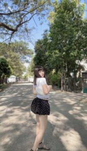 Captured on a quiet, tree-lined road, this image highlights a relaxed yet confident street-style moment. The natural lighting, soft shadows, and greenery create a calm atmosphere, while the simple outfit keeps the focus on clean fashion and effortless presence, making the photo feel fresh, modern, and very approachable for lifestyle audiences.