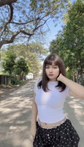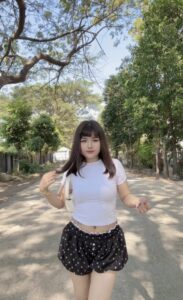 With a playful pose and natural background, this image reflects youthful energy and modern casual fashion. The surrounding trees and open road add depth and balance, while the outfit remains practical and trendy. It’s ideal for content focused on street fashion, daily outfits, or social media lifestyle features.